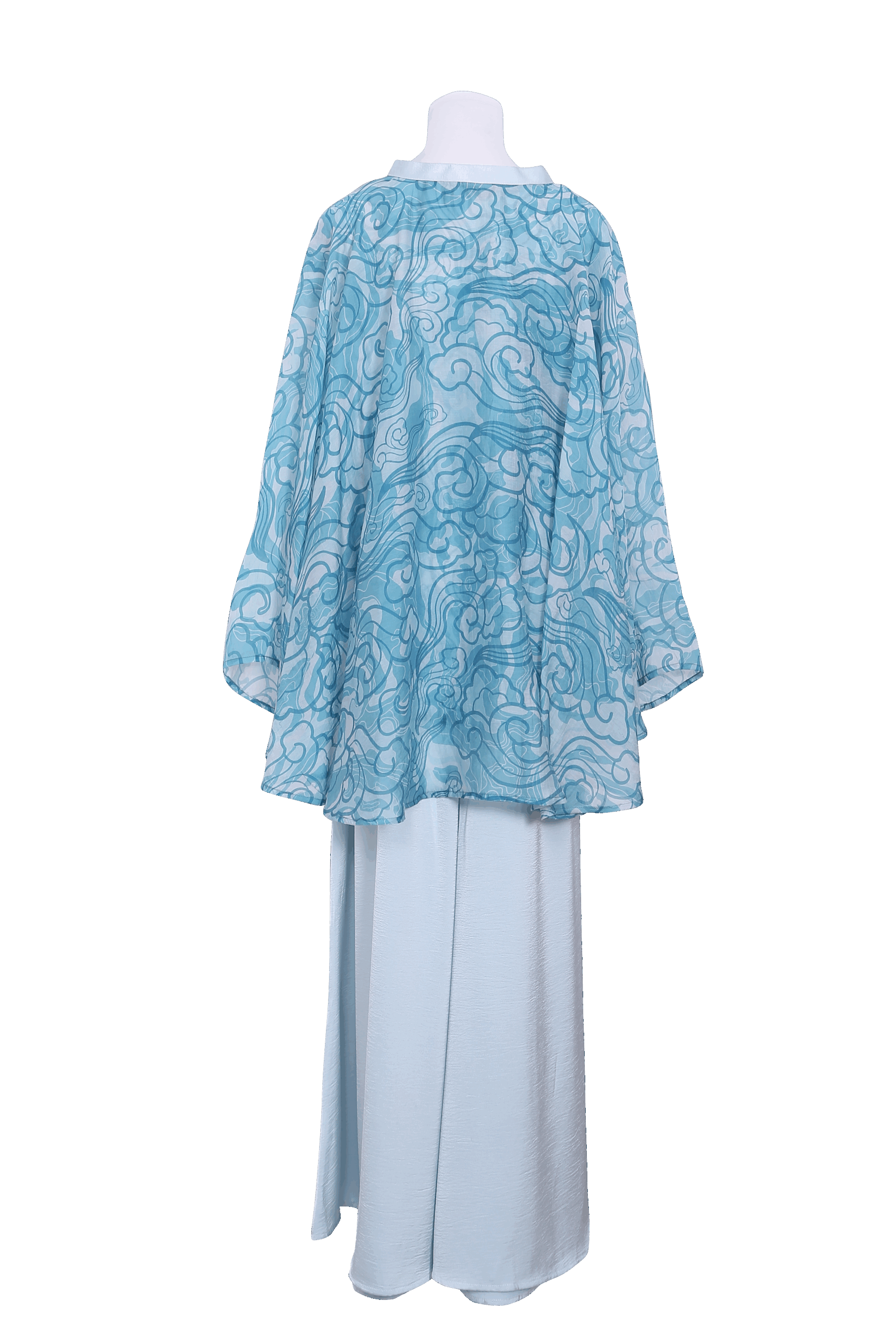 | Sky blue cord set, featuring sleek, comfortable pants paired with a kaftan-style printed top in soft, flowy fabric. |